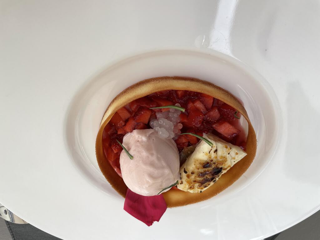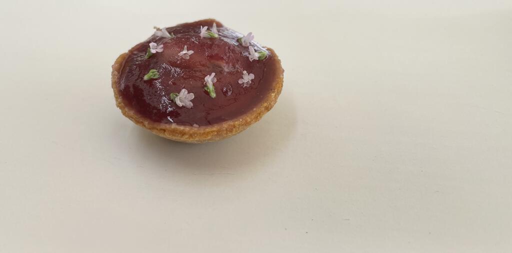 Tartin con fegato di maiale, ciliegia marasca e petali di aglio orsino