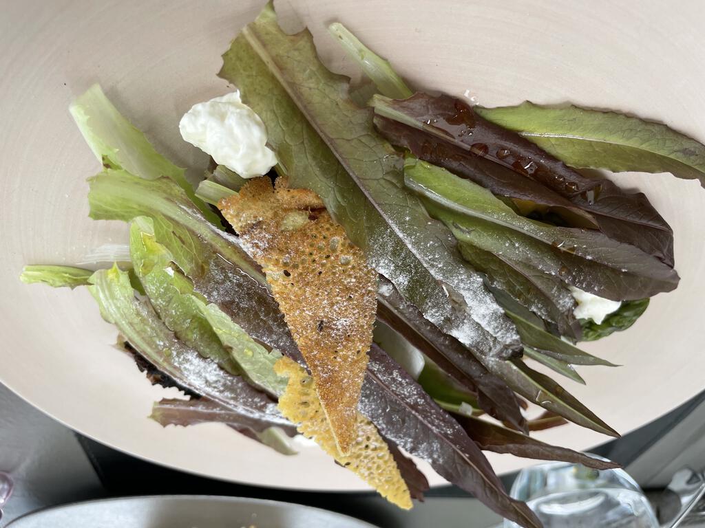 Insalata, asparagi bianchi e verdi, chutney di rafano, rombo